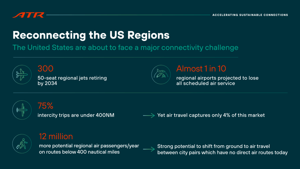Además, un estudio de ATR sobre los patrones de viaje de 80 millones de residentes estadounidenses, utilizando todos los medios de transporte, destaca la demanda de al menos 100 aviones adicionales. El estudio revela un mercado potencial anual de 12 millones más de pasajeros aéreos regionales en rutas de menos de 400 millas náuticas , entre pares de ciudades que actualmente no tienen rutas aéreas directas. En conjunto, esto indica una demanda total proyectada de hasta 300 aviones para satisfacer las necesidades de movilidad regional actuales y emergentes.