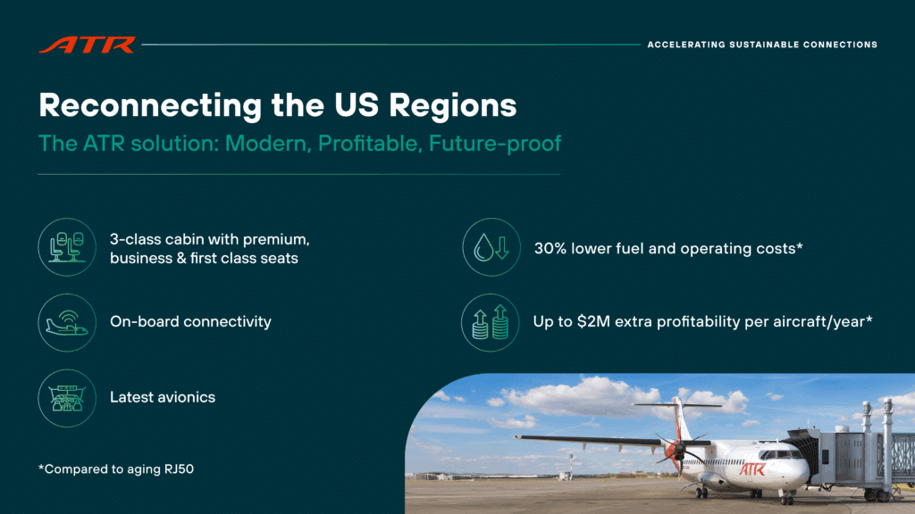 “El mercado regional estadounidense se encuentra en una encrucijada”, afirmó Alexis Vidal, Vicepresidente Comercial Sénior de ATR . “Con 300 aviones regionales que se retiran y decenas de comunidades que enfrentan la posibilidad real de perder el servicio aéreo, esto va más allá de las aeronaves. Se trata de ofrecer una solución probada y eficiente para reconectar a las comunidades y brindarles un acceso rápido a las oportunidades económicas en todo el país. Se trata de ofrecer a las aerolíneas una forma eficiente de avanzar para aprovechar la demanda sin explotar y abrir nuevas rutas de forma rentable, incluso con menos pasajeros. No se trata solo de reemplazar aeronaves, sino de revitalizar la región estadounidense”.