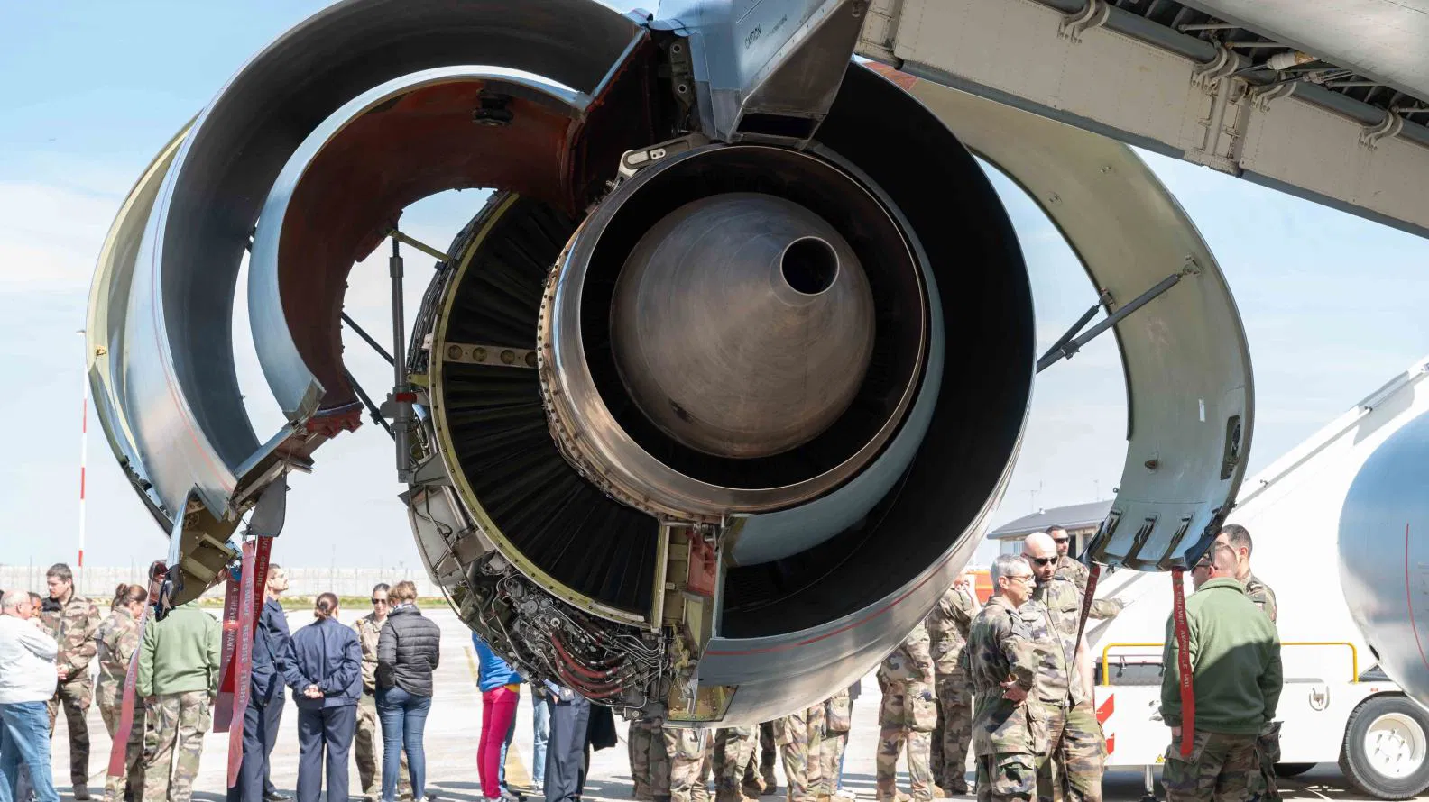 Thursday, April 3 – 1:30 p.m.: The weather is glorious. Without a shadow of a cloud, it gives us the opportunity to enjoy an open-air spectacle. The C-135 rests on the runway of the second largest base in France. For the second act of its tour, the crew has taken care of dressing the aircraft for the event. We see the French flag raised at the side door exit and then the refueling pole meticulously displayed at the rear of the aircraft. A presentation that gives us the opportunity to learn about the advantages of the large carrier. Journalists, aviators, Defense classes, and local personalities gathered to enjoy the same story. The visits continue inside the aircraft. In various groups, young and old are greeted by the pilots and in-flight refueling operators. A first step takes place in the cockpit where the captain explains the details of its piloting. An archaic piloting due to its old mechanics and robustness, but no less exciting for these pilots in search of operational efficiency.